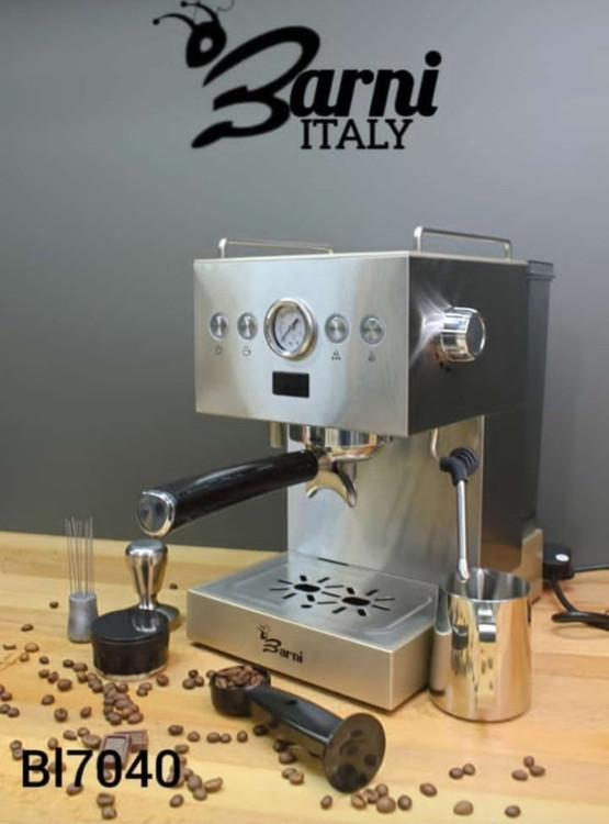 دستگاه اسپرسوساز نیمه صنعتی بارنی مدل 7040یک اسپرسوساز پر قدرت و کاملاً کاربردی ویژه مصارف خانگی، حرفه ای، کافی شاپ های کوچک، هایپرها، فروشگاههای بین راهی است. بدنه این دستگاه تمام استیل و اجزا داخلی و نازل بخار از فولاد ضد زنگ ساخته شده است. توان دستگاه 1500 وات و پمپ دستگاه ایتالیایی ULKA با فشار بخار 20 بار است. این اسپرسو ساز مجهز به پرتا فیلتر صنعتی (تک اسکوپ و دو اسکوپ ) با قطر ۵۸ میلی متر و نازل بخار با قابلیت چرخش از جنس استیل ضد زنگ است که عملیات تهیه کف یا فوم شیر را ساده تر می کند. اسپرسوساز بارنی مدل 7040 مجهز به سیستم گرمایی ترموبلاک می باشد به این صورت که با استفاده از تیوب و اجزای گرمایشی از جنس استیل ضد زنگ مانع از اکسیداسیون آلومینیوم شده و برای سلامتی مضر نیست. ظرفیت مخزن آب اسپرسو ساز بارنی مدل 7040 برابر با 1/8لیتر می باشد و دارای سیستم گرم کن فنجان و سیستم قطع اتوماتیک میباشد اسپرسوساز اتوماتیک بارنی مدل7040 مجهز به سیستم عصاره گیری به صورت اتوماتیک و دستی می باشد. که عصاره گیری اتوماتیک با زدن کلیدی که شکل فنجان قهوه روی آن قرار گرفته عصاره گیری را در عرض ۲۵ ثانیه انجام میدهد و به صورت اتوماتیک قطع میکند که این زمان را میتوان به دلخواه از ۱۰ الی ۶۰ ثانیه تغییر داد جهت تغییر این زمان کلید عصاره گیری اتوماتیک را فشرده و نگاه دارید تا به زمان دلخواه که رسیدید کلید را رها کنید تا زمان مورد نظر ست شود جهت ریست کردن زمان ست شده کلید عصاره گیری اتوماتیک و کلید بخار را همزمان فشار داده و به مدت ۵ ثانیه نگه دارید تا تنظیمات به حالت اولیه خود برگردد. با استفاده از کلید عصاره گیری دستی میتوانید به دلخواه خود عملیات عصاری گیری را قطع یا شروع کنید.این دستگاه دارای دو نازل مجزا جهت تولید آب جوش و بخار میباشد .